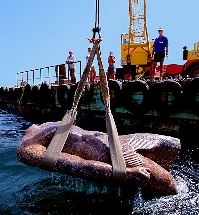 Right: The torso of a statue of a pharaoh is being raised. The colossal statue is of red granite and measures over 16.4 ft. It was found close to the big temple of sunken Heracleion.