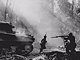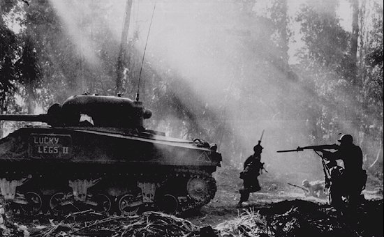 A tank goes forward as infantrymen follow in its cover. Each night