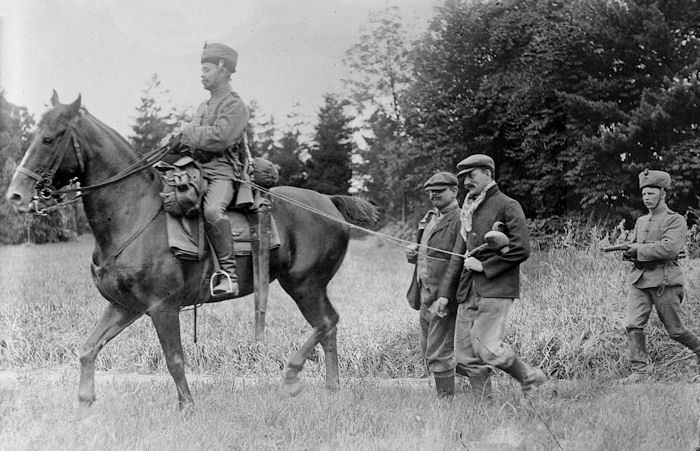 | Below: In the Belgian countryside, civilians taken prisoner by a German patrol. They are suspected of being franctiruers (irregular snipers) and therefore subject to being shot without mercy according to occupation orders issued by the German Army. |