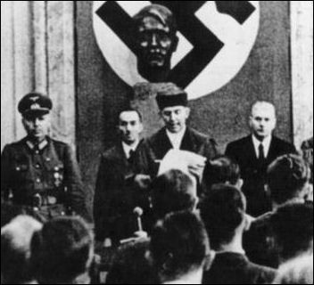 Standing beneath the swastika flag and a bust of Hitler, Roland Freisler, President of the People's Court, pronounces judgment on a group of defendants during one of several show trials held after the bombing. Below: Close-up of a stooped Hitler visiting the bedside of Admiral Karl Puttkamer who was injured in the bomb blast. |